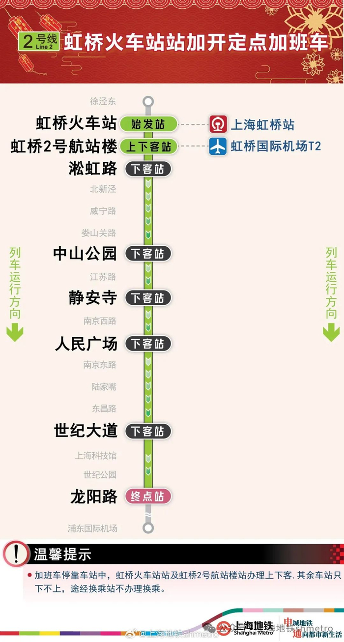 今日,2号线虹桥火车站加班车延长至2月18日2:30。2号线定点加班车始发站虹桥火车站站,终点站龙阳路站,中途停靠虹桥2号航站楼站、淞虹路站、中山公园站、静安寺站、人民广场站及世纪大道站。其中,除始发站虹桥火车站站以及虹桥2号航站楼站可同时上下客外,其余各停靠站点都只下不上,途经换乘车站不可换乘。
