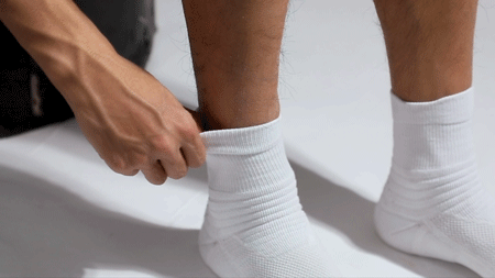 用手臂来使劲拉伸运动袜,看看它们的弹力。