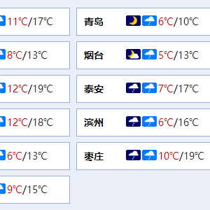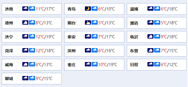 最高气温:鲁中和鲁南地区18℃左右,鲁西北地区16℃左右,其他地区12℃左右。