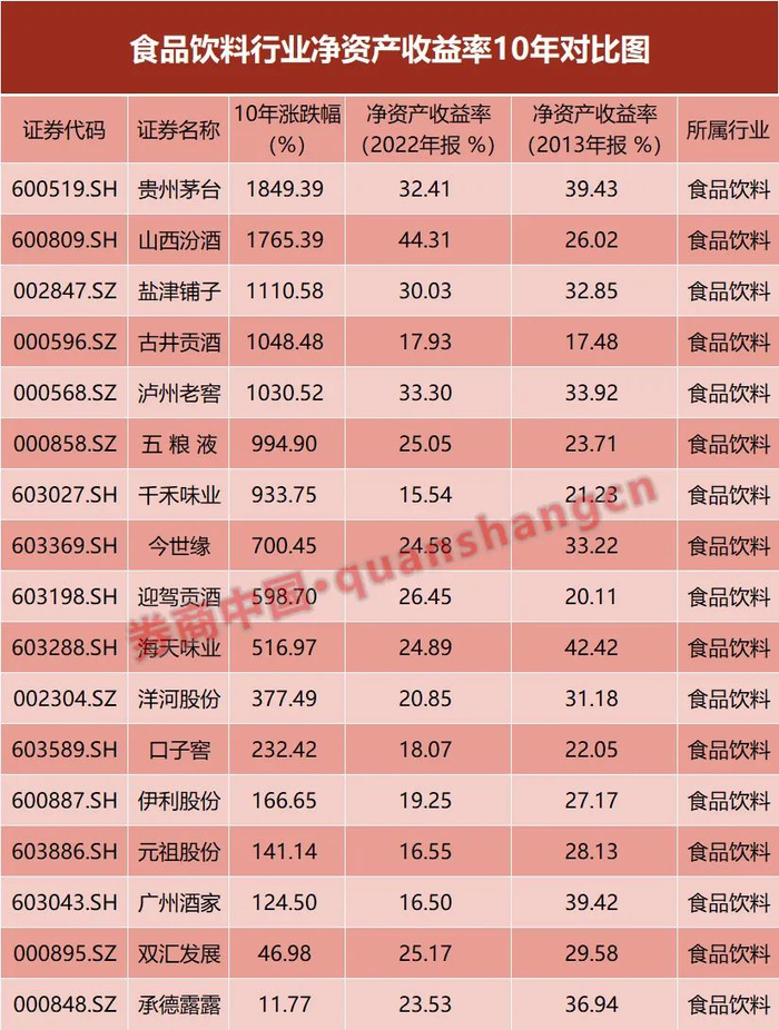 A股的贵州茅台2013年净资产收益率为39.43%,2022年的净资产收益率32.41%;山西汾酒2013年的净资产收益率为26.02%,2022年的净资产收益率44.31%。