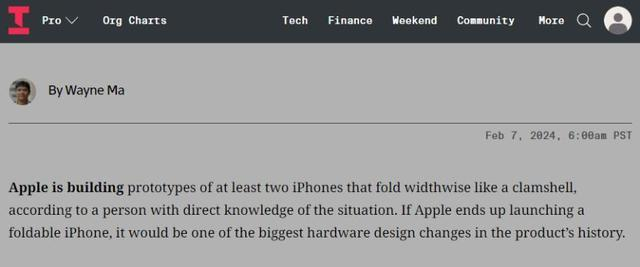 目前,暂停开发折叠iPhone的消息尚未得到苹果官方证实。