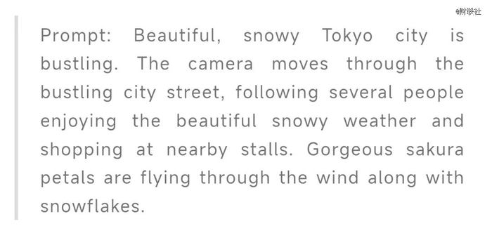 例如,某个Prompt(大语言模型的提示词)的描述是美丽、白雪皑皑的东京城市熙熙攘攘。镜头穿过熙熙攘攘的城市街道,跟随几个人享受美丽的雪天,在附近的摊位上购物。绚丽的樱花花瓣和雪花一起在风中飞舞。