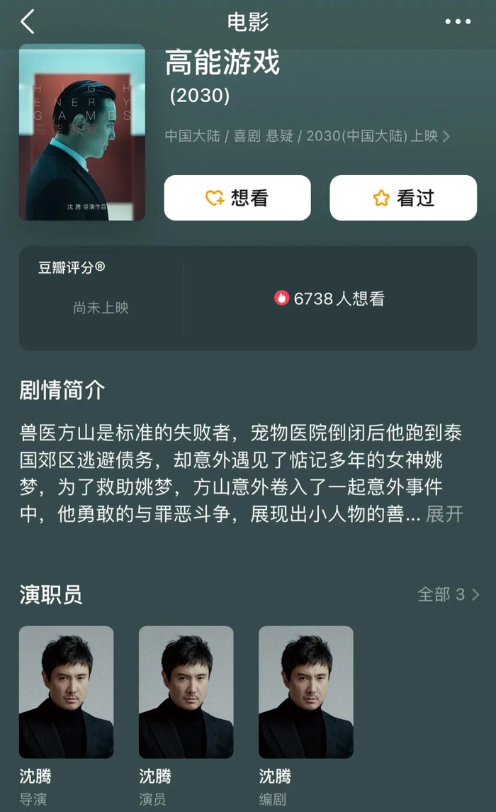 17日,龙年春节档迎来尾声,一则消息迅速冲上热搜榜,沈腾将自编自导自演喜剧悬疑电影《高能游戏》,“含腾量”(指沈腾参与一部影片的程度)100%。记者发现,在豆瓣平台上有关于该电影的简介,并显示有超6000人想看。