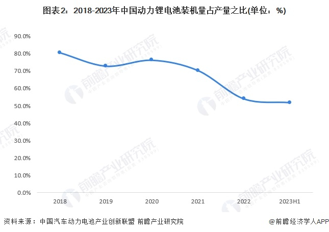 一是,我国动力锂电池行业供求失衡较为严重,行业供大于求,驱动动力锂电池企业价格战,导致动力锂电池价格下跌。具体来看,2018-2022年,我国动力锂电池装机量占产量之比基本保持在80%以下,且整体呈下降趋势。2022年,我国动力锂电池产量为545.9GWh,而装车量仅为294.6GWh,动力锂电池装车量占产量之比仅为54%。2023年上半年,我国动力锂电池装车量占产量之比下降至51.8%。行业供求失衡状况加剧,动力锂电池企业竞争市场空间导致价格战越演越烈。