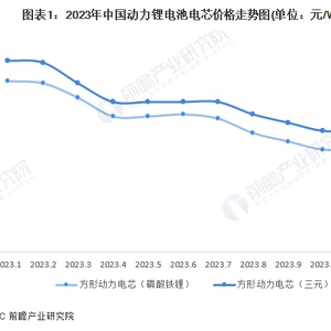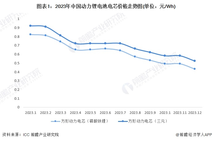 根据ICC披露的数据,2023年以来我国动力锂电池电芯价格持续下降。方形动力电芯(磷酸铁锂)价格从2023年1月的0.82元/Wh下跌至2023年12月的0.43元/Wh,降幅超47%;方形动力电芯(三元)价格从2023年1月的0.92元/Wh下跌至2023年12月的0.52元/Wh,降幅超43%。