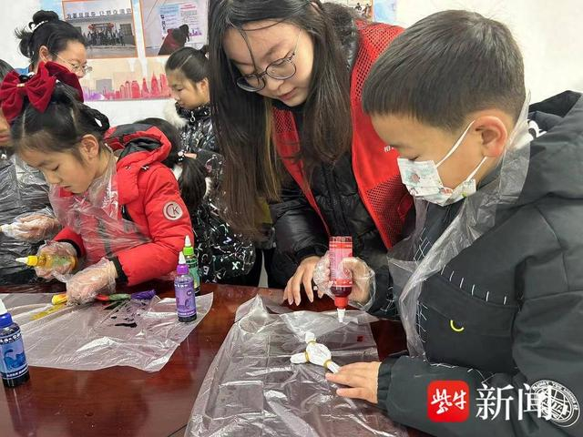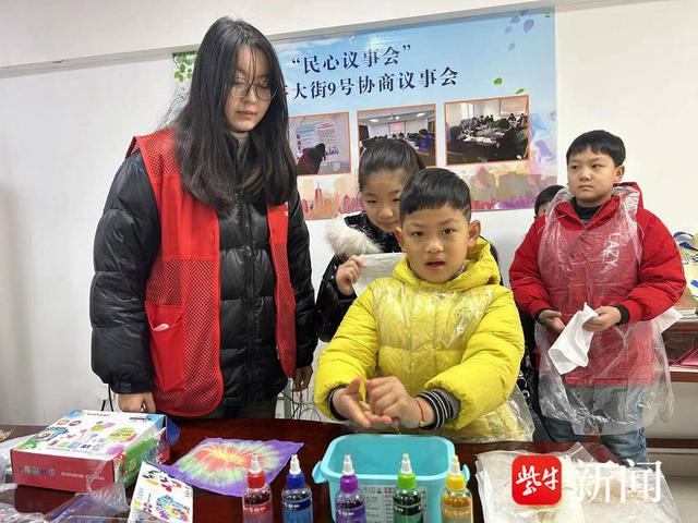 孩子们在志愿者的指导下,开启了扎染的创作之旅。在装有水的容器里把扎染小方巾浸湿再拧干;接着把材料做成想要的图案,用皮筋固定好造型;戴上手套,用染料滴入扎染衣物上,用吸管增加创意效果,最后,放入密封袋子里面静等30分钟。