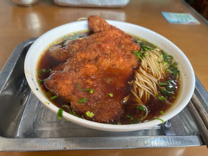 在厨房外间,咣当咣当的,有师傅将猪排往面粉里拍打,正面、反面都要滚过,拿手掌压实了,码在盒里待炸。再向外就是排队的顾客了,分为两个纵队,一队在收银处,付钱、拿了面票,便集成另一队,等在厨房的窗口前取面。