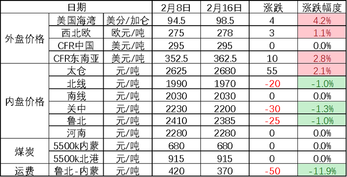 烧碱:价格方面,节内现货稳定,山东32碱维持2300元/干吨,50碱2340元/干吨,上下游因春节假期成交较少,节中山东液氯价格先涨后跌,整体价格重心略微上移,节前-50元/吨,节中触及250元/吨,当前50元/吨,其余地区液氯节中因安全手续原因无法外销,多被迫降氯碱负荷为主。外盘方面,近洋由于中国春节假期,碱价持稳,节中外贸成交有限。FOB西北欧440美元/干吨(+20)。