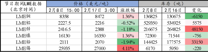 春节期间,外盘有色金属价格整体呈现先抑后扬震荡走势,涨跌幅品种间分化,LME铜、锌、锡上涨,LME铝、锌、铅小幅下跌。节日期间,LME库存方面,锌、铅分别大幅累库4.82万、3.32万吨,铝微幅累库5575吨,铜、镍、锡不同幅度去库。宏观方面,消息面整体多空交织。美国1月CPI环比高于预期,市场对美联储的降息预期降温,美债利率和美元指数整体震荡上行,压制金属价格;中国1月CPI同比降幅较12月的0.3%走阔至0.8%,CPI环比较12月的0.1%小幅回升至0.3%、略低于季节性水平,整体显示内需偏弱;1月全球制造业PMI回升1pp至50,17个月来首次回到荣枯线,显示全球制造业景气度回升。综合来看,短期市场对联储降息预期降温,叠加国内内需偏弱,有色金属价格预计维持总体震荡、品种分化格局,后续关注节后国内政策方面落地情况。