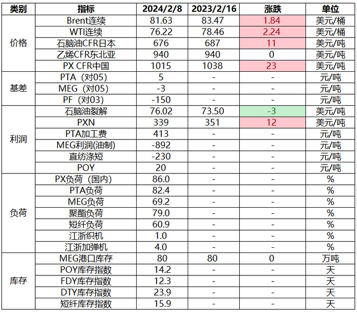 PF:估值方面,节前短纤现货加工费在767元/吨附近,盘面03加工费在800元/吨附近,节后预计跟随成本端走强为主。供需方面,节前短纤维持供需双减状态,虽然自身检修力度不低,但纱线端整体弱势表现拖累加工费。假期后预计短纤装置陆续重启,下游纱线端预计同步提负,考虑纱线端成品库存有所改善且原料库存处相对低位,预计阶段性补库需求将对加工费形成支撑,关注短纤装置重启进度以及后续需求是否存超预期表现。