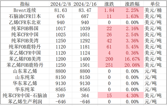 春节假期,布伦特原油价格上涨较多,石脑油价格小幅跟涨,乙烯价格持平。苯乙烯方面,欧洲现货价格领涨250美金,仍是全球苯乙烯价格最高的地区。主要原因是过去两个月多套装置停产后,产量大幅下降,而下游需求有所改善。美湾苯乙烯价格也大幅跟涨,在乙苯调油和出口欧洲之间相互竞争。外盘纯苯主要跟随原油上涨,总体外盘苯乙烯-纯苯价差走扩明显。后续关注国内出口商谈情况以及欧美装置检修动态。