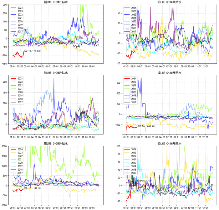 铜: 春节国内休市,伦铜先跌后涨,相较2月8日下午3时,2月17日伦铜价格上行117美金,较春节前上涨幅度达1.4%,贴水幅度也较节前有所收窄,截至2月16日,comex周度库存上升758吨至2.49万吨,LME库存下降1850吨至13.07万吨。国内方面,休市期间,除夕公布社融数据,新增社融放量,从分项看主要靠企业债券以及表外融资拉动,信贷方面居民贷款喜见增量,M1-M2剪刀差回落;海外方面,CPI全线超预期,PPI数据也超预期,市场降息预期继续受到打压,目前接近美联储点阵图公布的75bp,继续回调空间有限,节后预计铜价偏强运行。