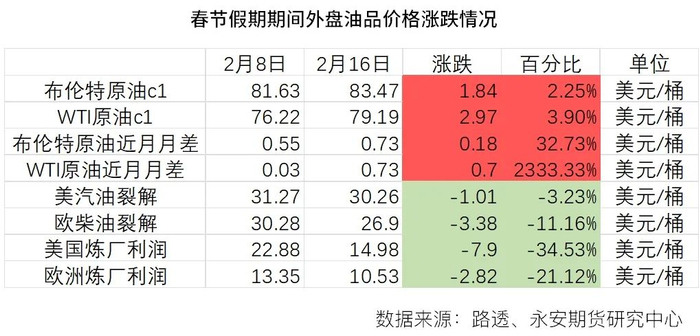 原油:2024年春节假期期间,受地缘政治因素影响,两市油价上涨。以色列-哈马斯和平谈判陷入僵局,8日以色列对加沙南部拉法地区发动大规模空袭,目前以军密集轰炸仍在继续。红海地区油运扰动继续,成品油运费高位。宏观方面,美国最新公布经济数据弱于预期,市场对于通胀降温、降息预期增强。库存方面,2月9日当周美国EIA商业原油累库1201.8万桶,为2023年11月3日当周以来最大增幅。炼厂产能利用率连续第六周下降,下降至80.6%,原油加工量减少了200万桶,拖累库存表现。IEA最新月报下调2024年全球油品增速2万桶/日至122万桶/日。成品油方面,美国汽柴油库存去库,新加坡、ARA地区成品油总库存累库,气温转暖,美国柴油表观消费量环比、同比大幅下滑,欧美炼厂利润下行。3月全球炼厂将进入较为密集的检修期,近期油价反弹但炼厂利润承压,中东局势不确定性较强,预期短期油价仍将维持震荡格局。