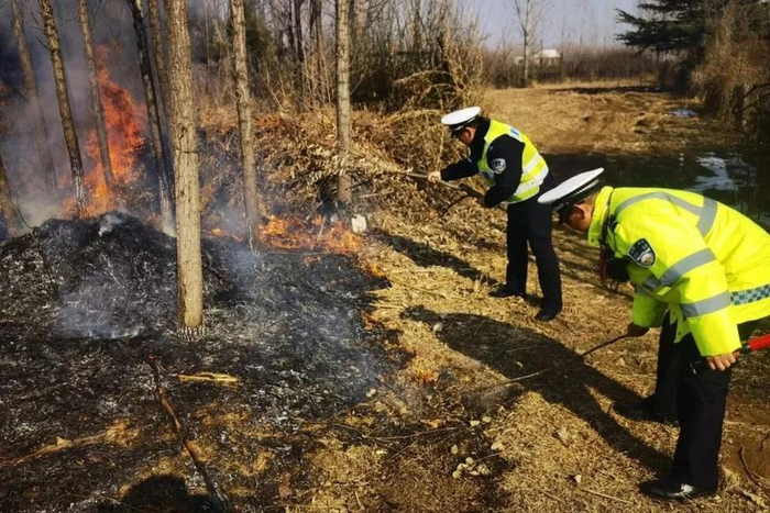 近日,泰安交警高新区大队北集坡中队执勤民警段崇进,辅警张强、白灿彬、李学德巡逻至南店子村时,发现环湖路东面绿化带及村民柴火燃烧,浓烟滚滚,火势随风势快速向四周蔓延,周边还有电线等危险物,如不及时将火扑灭,后果将不堪设想。