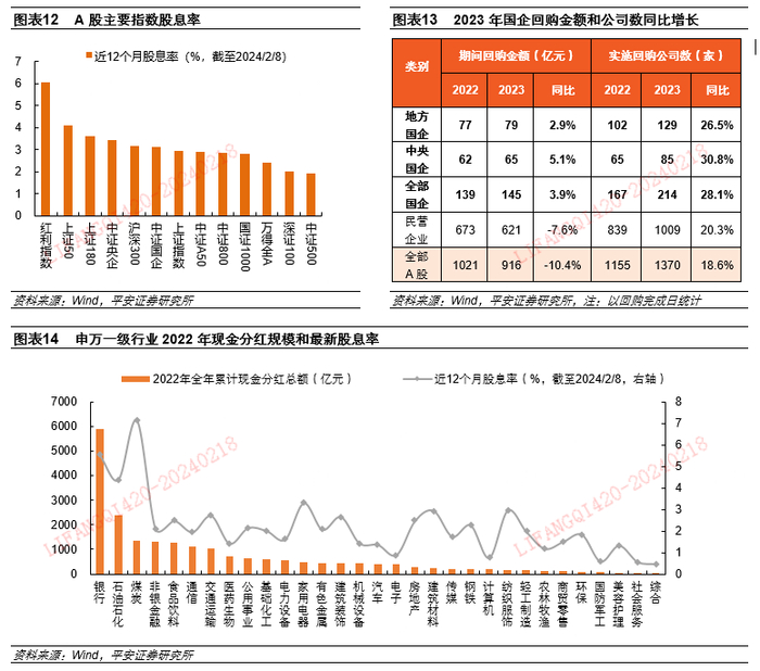 数据上看,2023年A股上市公司分红积极性继续提升,煤炭/银行/石油石化股息率高于4%,央国企分红规模占优。据证监会2024年1月12日新闻发布会披露,2023年,共有3361家沪深上市公司进行了现金分红,占2023年末上市公司总数的65.9%,全年现金分红总额2.13万亿元;平均股息率达3.04%,与全球主要资本市场相比处于中上游水平;243家公司实施中期分红,同比增长54.78%。结构上有两点特征:第一,煤炭、银行、石油石化行业分红规模居前股息率高于4%,据Wind数据,2022年分红规模居前的行业包括银行、石油石化、煤炭、非银金融、食品饮料、通信、交通运输,全年现金分红总额均超千亿元,截至2024年2月8日,煤炭、银行、石油石化的股息率在4%-7.5%之间;第二,国企现金分红规模占优,相关指数股息率高于3%,2022年,国有上市公司的合计现金分红金额达1.5万亿元,其中央企上市公司的现金分红金额达1.1万亿元,分别占全部A股的70%和50%,截至2024年2月8日,中证国企和中证央企指数的股息率分别为3.1%和3.4%,具有较高的投资吸引力。