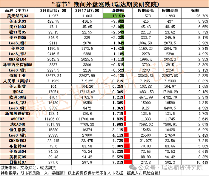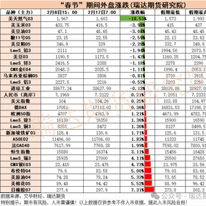 春节假期期间,全球主要股指多数上涨,日经225指数累计上涨4.31%,美国主要指数以宽幅震荡为主。同时,港股及海外中国资产表现较为强势,恒生指数实现三连阳,涨近3%。A50指数则大涨5.8%,在全球主要指数中表现靠前。基本面来看,1月金融数据实现开门红,在去年高基数的基础上,结构上亦有一定改善;此外央行续作5000亿MLF,Q4贷款加权平均利率回落至4%以下,总体利好风险偏好的回升。时间上看货币政策宽松窗口仍在,一季度降息仍有可能。春节期间国内消费和出行等数据大幅增长,预计对2月经济数据有一定的提振效应。展望后市,虽然海外流动性宽松预期反复,但国内经济增长压力尚未完全缓释,节后仍有可能进一步降准降息,流动性维持宽松判断;此外节后两会来临,保增长相关的政策预期大概率上升,政策信号更偏正面。短期来看,近期中国资产风险偏好显著回升,叠加节前诸多重要资本市场举措落地,一定程度上利好A股开盘情绪,A股节后修复行情有望延续。策略上,涨势有望延续的行情下,关注各期指低多机会,升水环境下建议多远空近跨期套利。