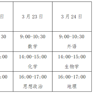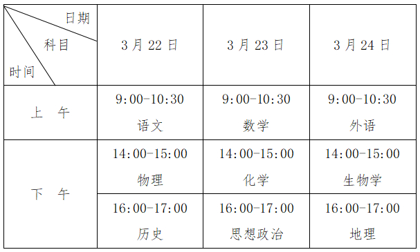 语文、数学、外语考试时长均为90分钟,思想政治、历史、地理、物理、化学、生物学、信息技术和通用技术(合卷)考试时长均为60分钟。具体考试安排如下: