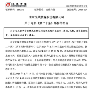 2月18日,光线传媒(300251.SZ,股价7.6元,市值222.95亿元)公告,子公司主投、发行的影片《第二十条》已于2月10日起在中国大陆地区公映。