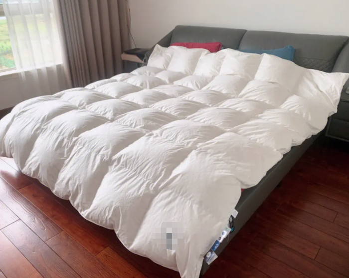 3.“拍”:拍打或揉搓后观察表面和绗缝等地方,如有绒毛钻出或粉尘溢出,说明羽绒被防钻绒性差,或填充的羽绒质量较差,不宜选购。