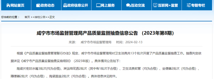根据《产品质量监督抽查管理暂行办法》规定,咸宁市市场监督管理局对卫生洁具共13个批次开展了产品质量监督抽查工作。抽查判定依据详见《咸宁市产品质量监督抽查实施细则》(2023年版)。具体情况公告如下: