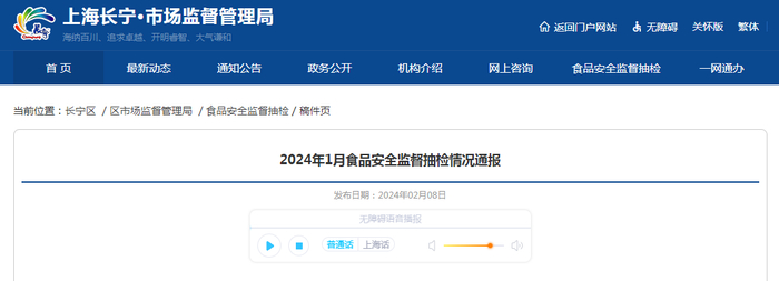 上海市长宁区2024年1月食品安全监督抽检情况通报