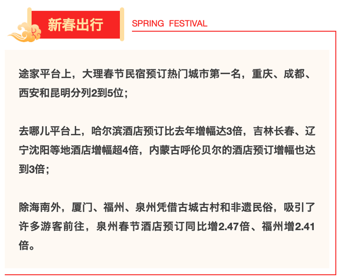 数据显示,初一至初三,杭州西湖风景名胜区、南京夫子庙秦淮风光带景区、成都青城山都江堰景区、西安大唐芙蓉园、重庆解放碑、丽江古城景区、广州长隆旅游度假区、苏州园林景区、哈尔滨中央大街、沈阳中街成为十大热门景点。网约车叫车需求涨幅明显。