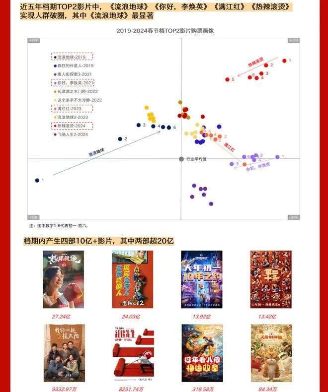此外,三四线城市的票房占比攀升至58.9%,达到过去五年的最高点,这一数据凸显了下沉市场在电影消费中的增长潜力和重要性。家庭观影的比例也有所上升,合家欢类型的喜剧电影尤其受到欢迎,反映了春节期间,观众对于温馨家庭、娱乐内容的偏好。今年春节档电影市场出现了四部票房突破10亿元的影片,其中《热辣滚烫》和《飞驰人生2》两部作品实现了超过20亿元的票房