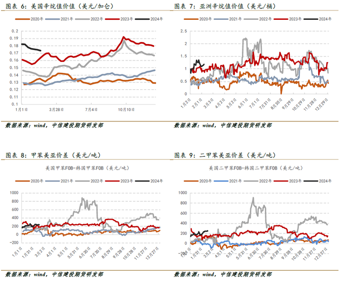 调油方面,节前亚洲辛烷值价值上行,截至2月7日,亚洲辛烷值价值较2月2日上升0.34美元至5.9美元/桶,涨幅约5.7%。芳烃美亚套利窗口尚未打开。