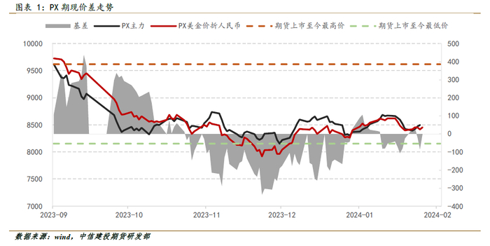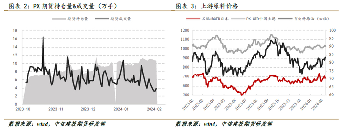 节前原油价格反弹,带动PX期现价格上行。截至2月8日,PX2405期货合约结算价环比上涨76元至8500元/吨,涨幅约0.9%。PX主力持仓量环比减少0.5万手至10.6手,跌幅约4.1%。