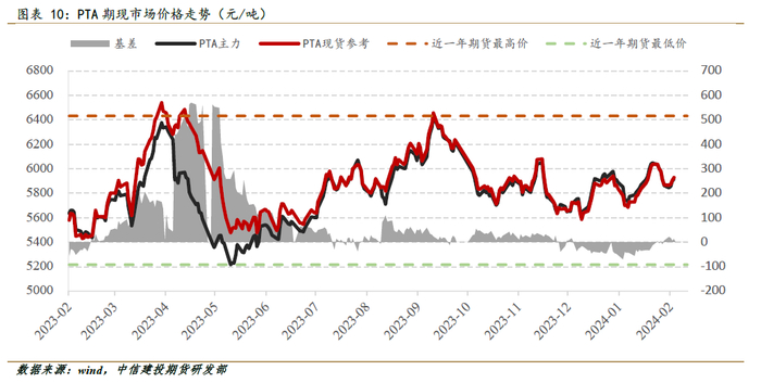 原油受宏观等因素影响反弹,PTA价格上行,截至2月8日,PTA2405合约结算价环比上升54元至5918元/吨,涨幅约0.9%。PTA现货参考价格环比上升60元至5930元/吨,涨幅约1%。天气影响下,近期货物运输受限,基差小幅走强。