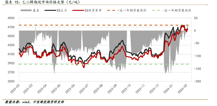 截至2月8日,EG主力合约价格环比下跌11元至4641元/吨,跌幅约0.2%。EG华东现货参考价格环比上涨30元至4660元/吨,涨幅约0.6%。基差环比走强41元至19元/吨。