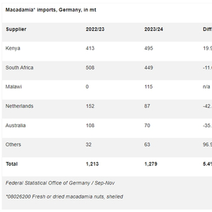 德国在2023年9月至11月期间的进口与上年同期相比略有增长5.4%。肯尼亚以495吨取代南非成为最重要的供应国,另一个非洲生产国马拉维位居第三。相比之下,荷兰和澳大利亚对德国的出口损失相当大,分别为-42.8%和-35.2%。