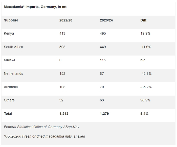 在肯尼亚,政府决定允许出口带壳夏威夷果促进贸易。中国尤其表现出了浓厚的兴趣,但据OLAM称,肯尼亚坚果的质量仍然是一个挑战。此外,由于农场规模和种植方法不当,导致肯尼亚的产量仍然较低。尽管如此,目前估计2024年的产量为45,000公吨,比去年的41,150公吨有所增加。