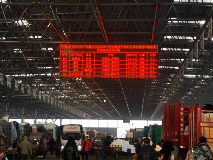 寿光农产品物流园虽然位于寿光,但已实现“买全国、卖全国”,全国各地的蔬菜在此集散交易。交易大厅内的电子屏上,滚动着各地的蔬菜品种以及检测情况,记者观察到,交易的蔬菜产地包括云南、四川、福建、上海、广东等。