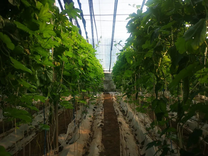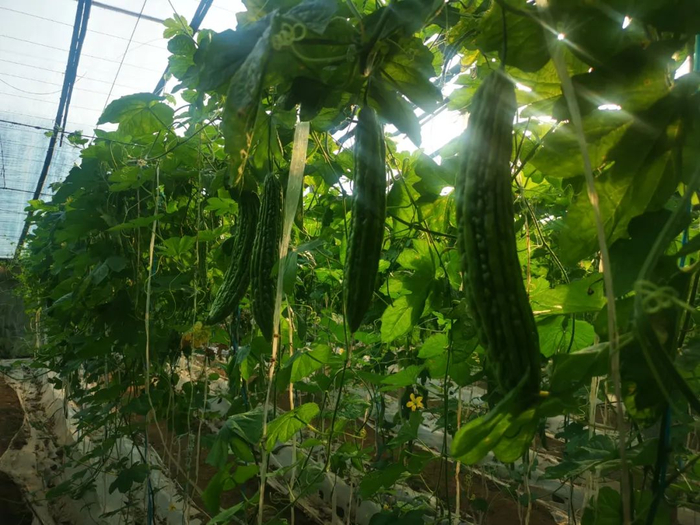 大棚内则“别有洞天”。在寿光孙家集街道一带,春节时正是苦瓜的采摘期,干净整齐的棚内郁郁葱葱,藤蔓下挂着一个个硕大的苦瓜。