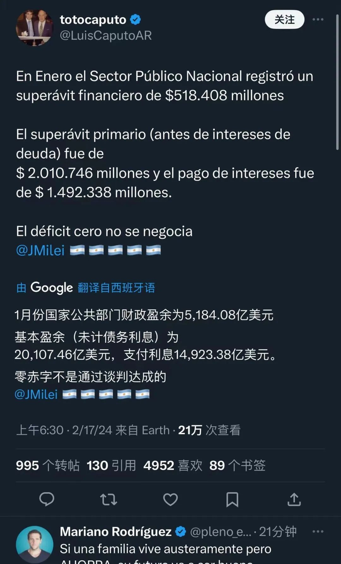 今天,阿根廷政府财政部长卡普托发推,说阿根廷1月份财政盈余为5184亿比索(图片中的机翻有误,不是美元,是比索)。并附上一句评论:零赤字不是通过谈判达成的,然后@了米莱。