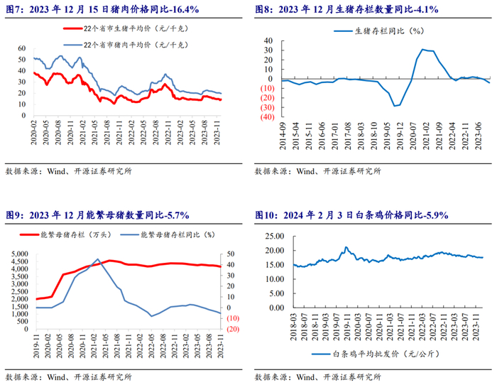 12月15日,生猪价格14.5元/公斤,同比-5.5%,环比+3.9%;猪肉价格19.9元/公斤,同比-16.4%,环比-1.6%。2023年12月,能繁母猪存栏4142.0万头,同比-5.7%,环比-2.3%。2023年12月生猪存栏同比-4.1%。当前看猪价上涨缺乏动力。2024年2月3日,白条鸡价格17.6元/公斤,同比-5.9%,环比+0.9%