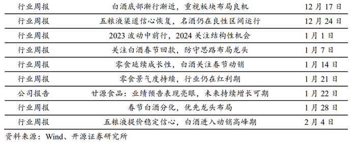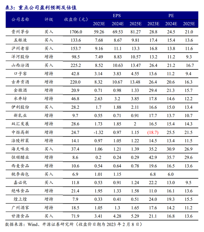 (1)山西汾酒:汾酒延续景气度,短期春节渠道回款积极,中期成长确定性较高。汾牌产品结构升级同时杏花村、竹叶青同时发力,全国化进程加快。(2)贵州茅台:公司以i茅台作为营销体制、价格体系和产品体系改革的枢纽,未来将深化改革进程,提价后动能释放,公司此轮周期积蓄的潜力进入释放期。(3)甘源食品:年内营收仍保持较快增长,零食专卖店、会员店、电商等渠道拓展预期放量。量贩零食赛道头部品牌开始整合,行业仍处红利释放期。(4)中炬高新:新任管理层到位,公司内部机制理顺,调味品业务走向正轨,未来经营改善可期