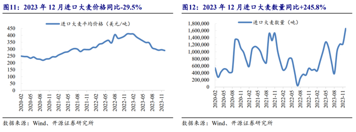 2023年12月,进口大麦价格289.4美元/吨,同比-29.5%。2023年12月进口大麦数量166.0万吨,同比+245.8%。受益于澳麦双反政策取消,进口大麦数量回升,平均价格持续下降,啤酒企业原料成本有望得到缓解