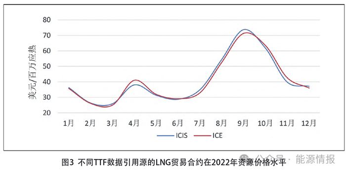 如图3所示,展示了数据引用源对对合约执行价格差异的影响。以挂钩TTF的指数合约为例,图中横轴表示资源到港时间,纵轴表示对应货物到港时间资源的执行价格,蓝色线表示ICIS发布月均数据,红色线表示ICE的TTF期货合约月均数据。可以看到,同样的边界条件下因货物所在合约对指数数据引用源约定的差异将使得货物的价格执行结果也有一定差别。