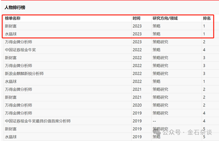 从2014年入行以来,他各项荣誉傍身,成为新财富、水晶球、新浪金麒麟、万得等分析师榜单常客, 并在2023年第一次拿到新财富策略第一名。入行10年,可谓晋升飞快。
