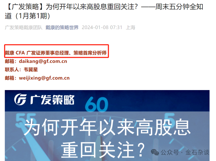 说到这,我们不禁好奇:戴康去哪了?根据戴康公众号,1月8日的时候他还是广发策略首席,1月10日的时候依然是广发策略,但之后均变成了广发研究。
