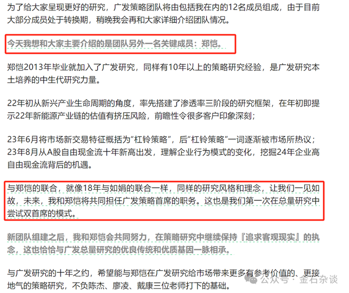 此外,在刘晨明官宣离职的公众号上,他还着重介绍了广发策略另一位关键成员郑恺,他2013年就加入了广发研究,同样拥有10年以上的策略研究经验,是广发研究本土培养的中生代研究力量。