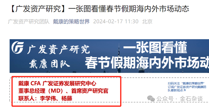 最新的title的则变成了广发证券发展研究中心董事总经理(MD)、首席资产研究官。而刘晨明和郑恺则是ED,职级较戴康低一级,同属广发研究中心。所以,金石杂谈粗浅的认为,戴康依然是广发策略(广发研究中心)的老大,不过属于退居一线,也就是不用那么累死累活写研报了。