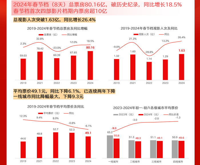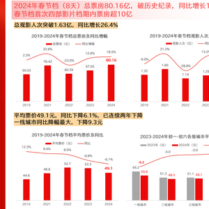 《报告》显示,2024年春节档总票房80.16亿元,打破历史纪录,同比增长18.5%,总观影人次1.63亿,同比增长26.4%,观影需求达到新高。