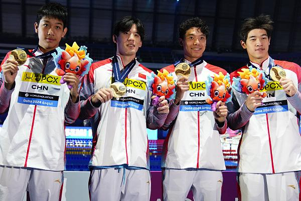 张展硕、王浩宇、季新杰、潘展乐为中国队夺得4X200米自由泳接力金牌