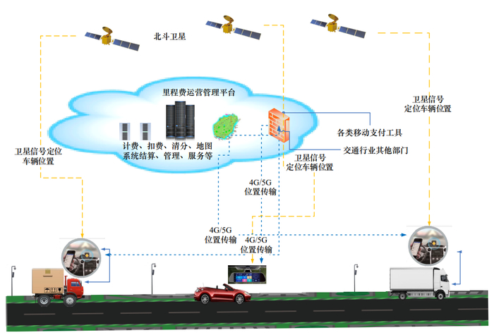 新能源汽车发展迅速,燃油汽车的市场占有率持续下降,导致建立在燃油汽车基础上的“燃油税”覆盖率急速降低。论证提出了新一代公路智能税费征收系统开发方案(见图3),旨在基于北斗卫星导航系统计量车辆行驶里程,合理征收车辆“里程税”以替代“燃油税”。采取“用路者付费”原则,将单车税收与车辆行驶里程挂钩,反映车辆对公路的磨损和损害程度;征税体系透明、公平、合理,适用所有类型车辆、全国公路网(含城市道路),是构建新的公路税费制度的基础设计。系统采用“云 – 端”技术架构实现“里程税”的计费、收费功能,无需新建收费站及附属设施,具有开放性、全网络、无感自由流收费、快速通行、高信用、实时动态监控等技术特征。对于收费公路,系统可以取代现有的收费技术来征收通行费;对于普通开放道路、城市拥堵路段,可收取(必要的)拥堵费、城市道路停车费。通过差异化收费、拥堵收费等策略,实现调节路网拥堵路段的交通流、优化高速公路网与普通公路网资源配置的目的。