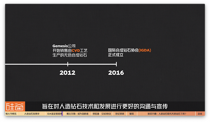 2016年,国际合成钻石协会(IGDA)正式成立,总部设在美国,旨在对人造钻石技术和发展进行更好的沟通与宣传,同时进行更加统一规范的术语和行为指引,从而促进整个实验室人造钻石行业的发展。