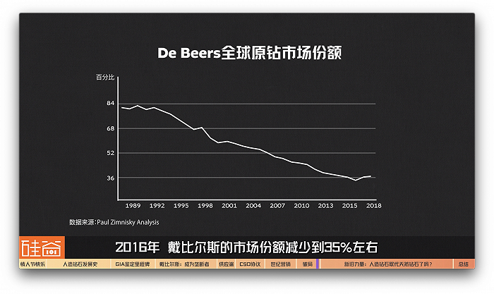 而对于第一级到第三级钻石经销渠道来说,虽然戴比尔斯的垄断地位不再,但依然是业界非常有影响力的玩家,此前近百年打造的完善的钻石贸易体系,以及,天然钻石和爱情的绑定概念仍然被沿用了下来。因此,戴比尔斯等天然钻石巨头依然可以在开采源头控制数量和价格,将天然钻石价格维持在高价。