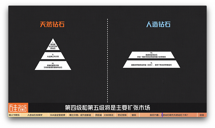 而看上去,第一级到第三级实验室培育钻石都无法进入,第四级和第五级将是主要扩张市场。所以我们看到,宠物毛发培育钻石,骨灰钻石等等噱头的商业模式,都是人造钻石商目前正在尝试的叙事和推广。